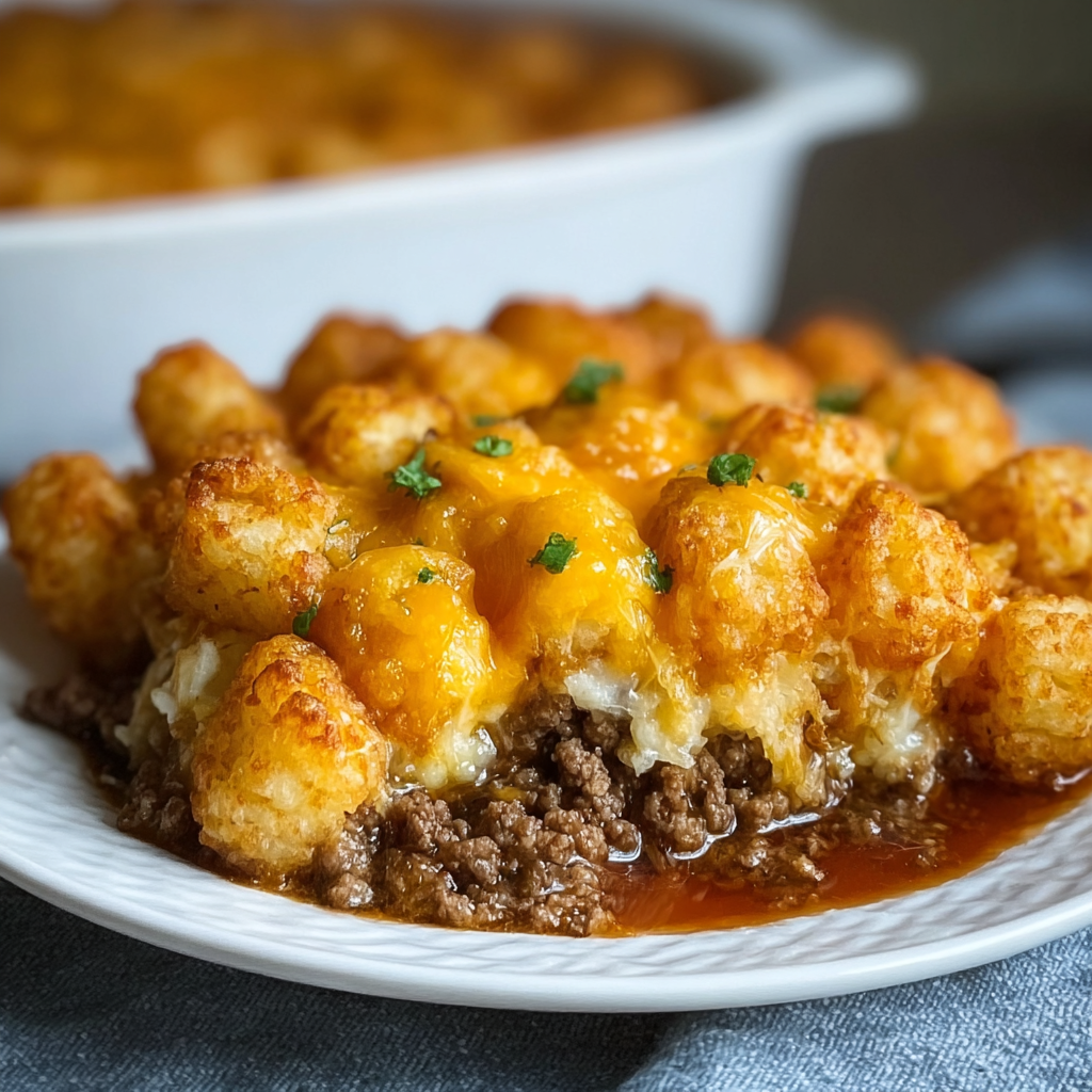 This Tater Tot Casserole combines ground beef with cream of mushroom soup, topped with frozen