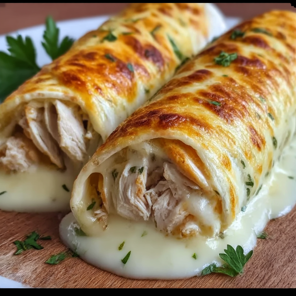 Cheesy garlic chicken wraps bring together juicy shredded chicken and a variety of cheeses, tucked
