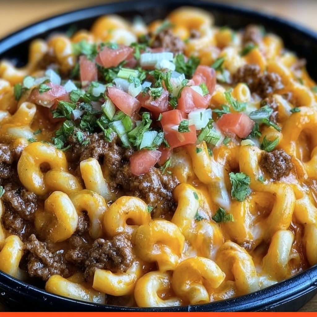 This Taco Mac and Cheese combines elbow macaroni with taco-seasoned ground beef in a creamy