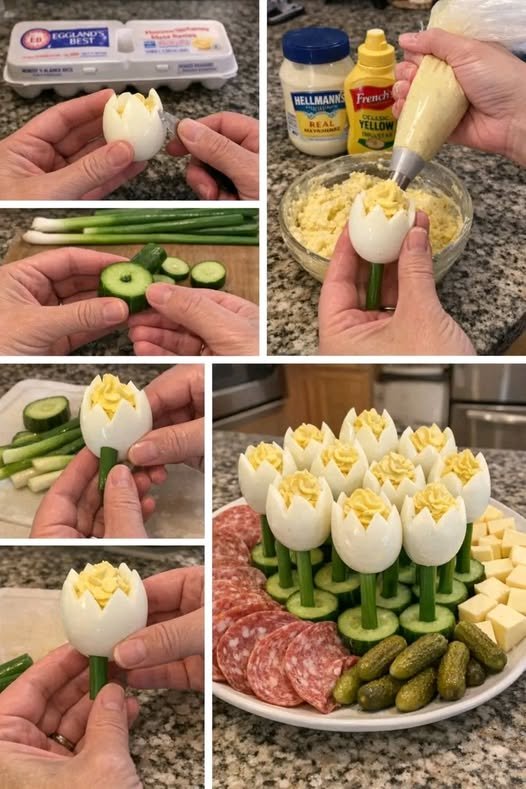 A beautiful and creative appetizer that looks like tulip flowers made from deviled eggs. Perfect