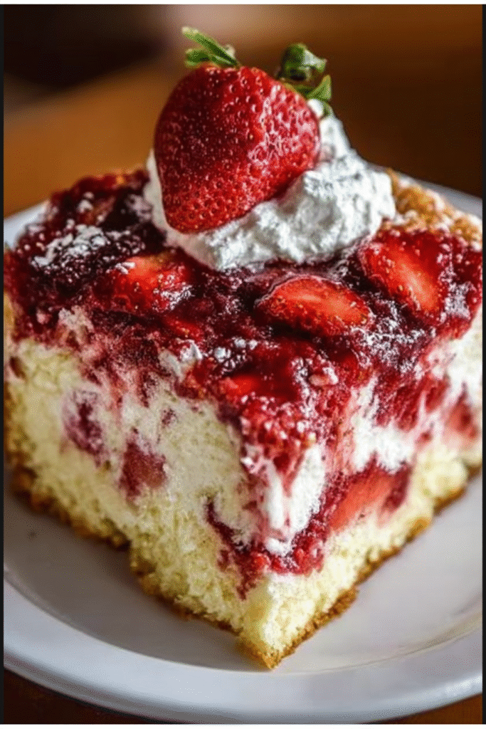 This Strawberry Earthquake Cake creates a dramatic dessert by layering strawberry cake batter with dollops