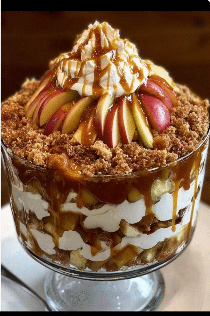This stunning Caramel Apple Trifle combines layers of tender pound cake, creamy vanilla pudding, spiced apple pie filling, and rich caramel sauce in a beautiful glass bowl that showcases each delicious layer. The dessert brings together the classic fall flavors of caramel apples with the elegant presentation of a traditional