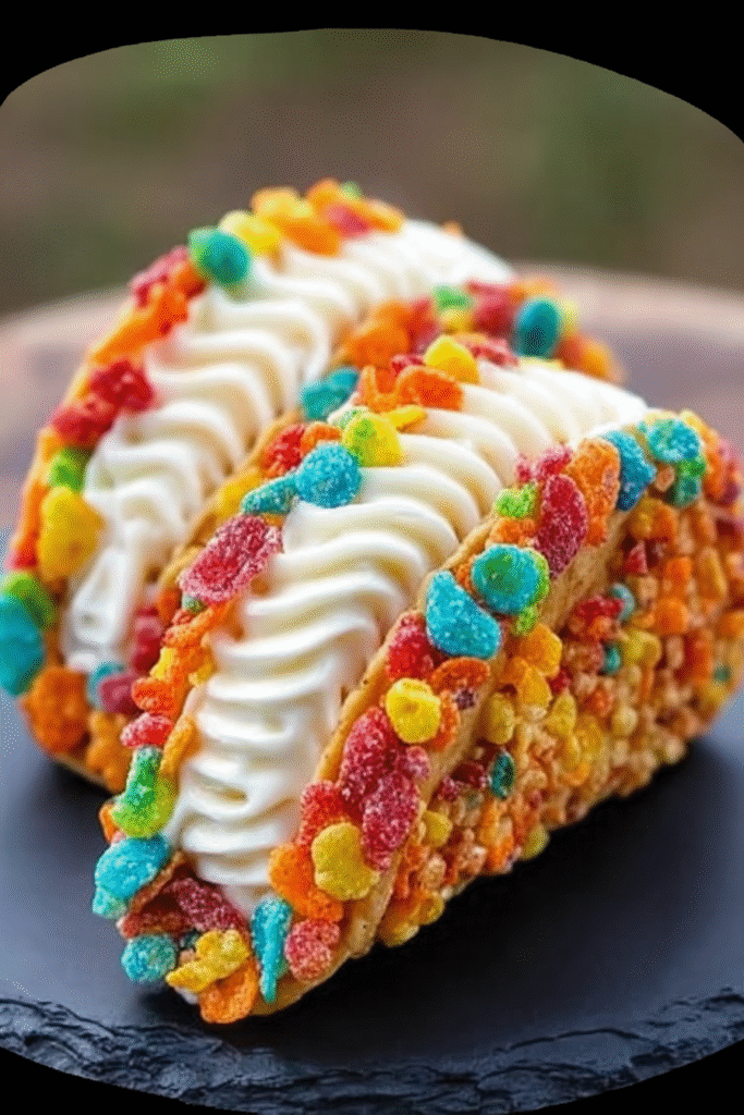 These Fruity Pebbles Cheesecake Tacos create a whimsical dessert by shaping colorful cereal and butter