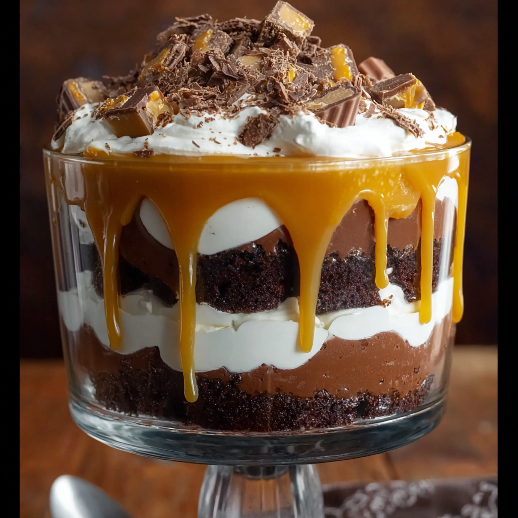 This recipe creates impressive layered dessert using simple assembly and convenience products. The trifle format showcases attractive layers while providing textural variety from brownies, pudding, and whipped cream. The estimated 450-600+ calories per serving reflects the rich combination of brownies, pudding, caramel sauce, whipped cream, chocolate chips, and nuts – making this appropriate only for special occasions. For a lighter version, use sugar-free pudding mix, light whipped topping, and reduce the caramel sauce to a thin drizzle.