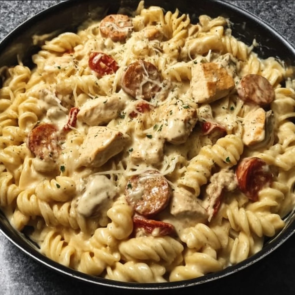 This Creamy Pepper Jack Chicken & Sausage Pasta combines diced chicken breast with sliced chicken sausage in a rich cream sauce flavored with Pepper Jack and Parmesan cheeses. The recipe creates a substantial one-pan meal that delivers protein and pasta in a creamy, mildly spicy sauce. The technique involves browning the meats separately for proper texture, then combining everything in a cream-based sauce that coats the pasta effectively.