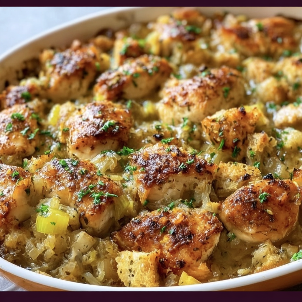 The recipe is essentially identical to the “Chicken and Stuffing Casserole” reviewed earlier, with minor variations in wording and optional add-ins. Both use the same basic formula: shredded chicken + cream soups + sour cream + boxed stuffing mix.