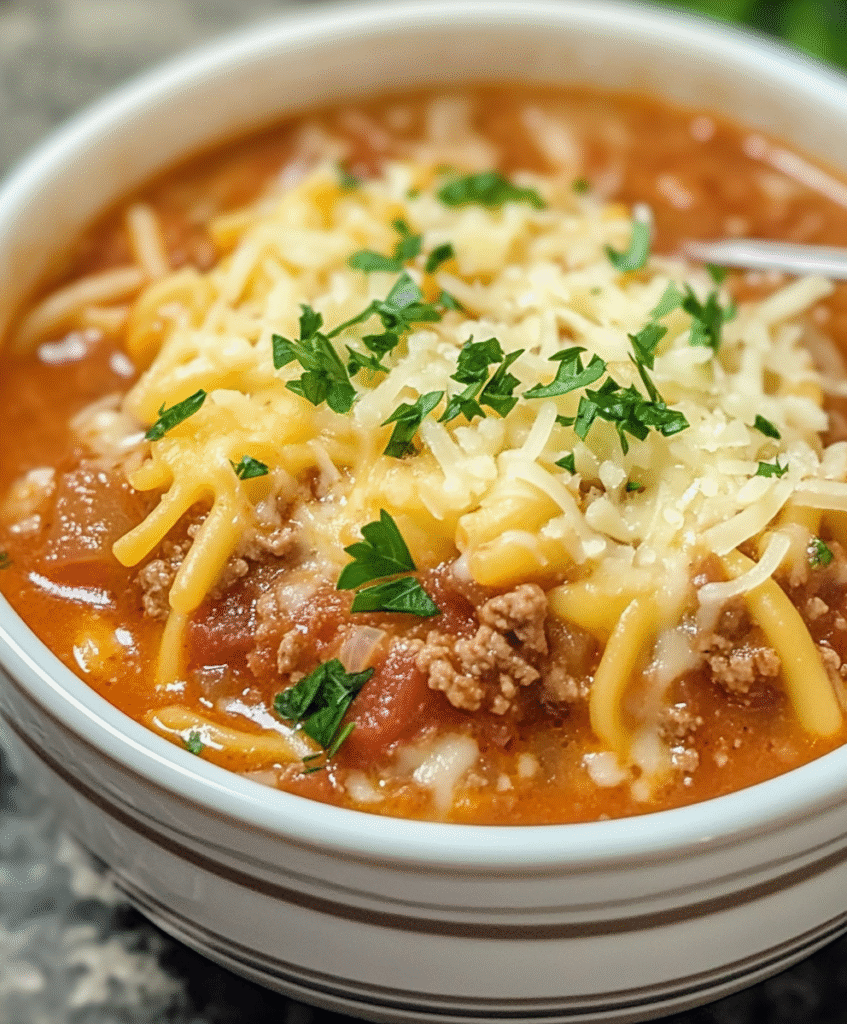 The slow cooking method allows flavors to develop deeply while the broken pasta pieces create a more soup-like consistency that’s easier to eat and serve. The cheese garnish on each bowl recreates the rich, creamy element that makes lasagna so satisfying.