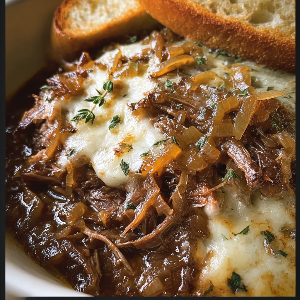 The result delivers fork-tender beef with sweet onion flavor and optional melted Gruyere topping.