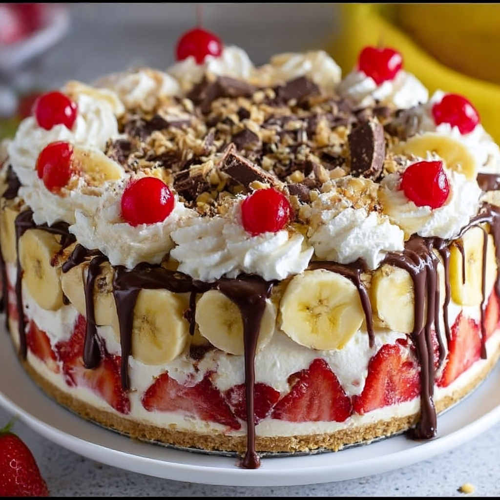 This no-bake cheesecake is more than a treat—it’s an experience that brings the beloved ice cream parlor favorite into your own kitchen. Whether you’re hosting a backyard barbecue, planning a festive holiday meal, or simply craving a creamy, fruity dessert without turning on the oven, this recipe delivers all the visual appeal and flavor satisfaction of a traditional banana split in an elegant, shareable format. The beauty lies in its layered construction that showcases each component while creating a cohesive dessert experience.