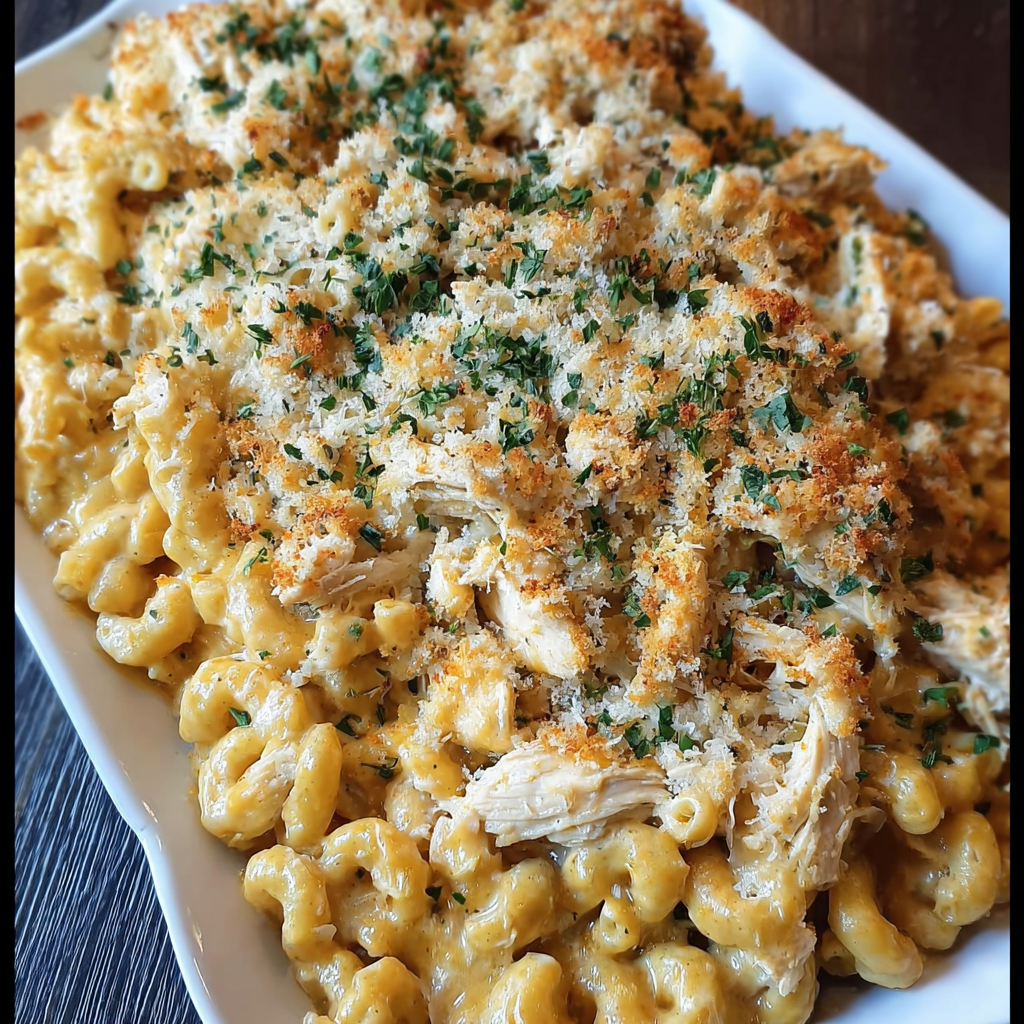 This Parmesan Garlic Chicken Mac and Cheese combines slow-cooked chicken with macaroni in a creamy cheese sauce for a comfort food dinner. The recipe creates a one-pot meal by cooking seasoned chicken in Parmesan garlic sauce, shredding it, then mixing with partially cooked pasta, milk, and multiple cheeses in the