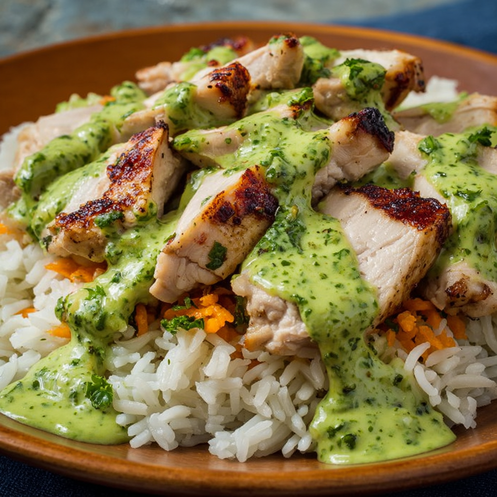 This Peruvian-inspired meal succeeds because the marinade properly seasons and tenderizes chicken while the turmeric rice provides colorful, flavorful base. The fresh green sauce adds brightness and creaminess that ties everything together. The balanced combination of protein, starch, and sauce creates satisfying complete meal.