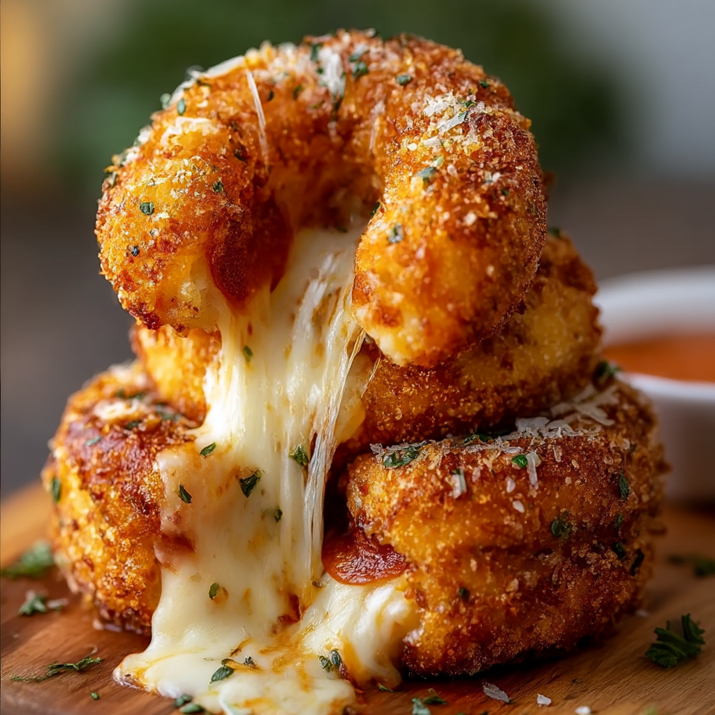 These Stuffed Pizza Onion Rings transform the classic appetizer into an indulgent fusion snack that combines the best elements of onion rings, mozzarella sticks, and pizza flavors. Thick onion rings are filled with stretchy mozzarella cheese and savory pepperoni, then coated in seasoned breadcrumbs and fried until golden and crispy. The result is a crowd-pleasing appetizer that delivers the satisfying crunch of onion rings with the gooey, cheesy center that makes this snack irresistible.
